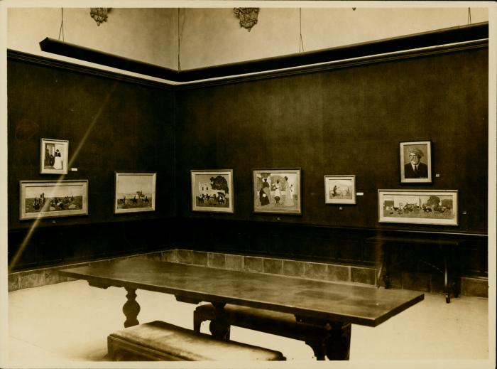 Ocho pinturas montadas sobre el muro oscuro. En el centro de la sala, una mesa de madera con bancos. bordes blancos.