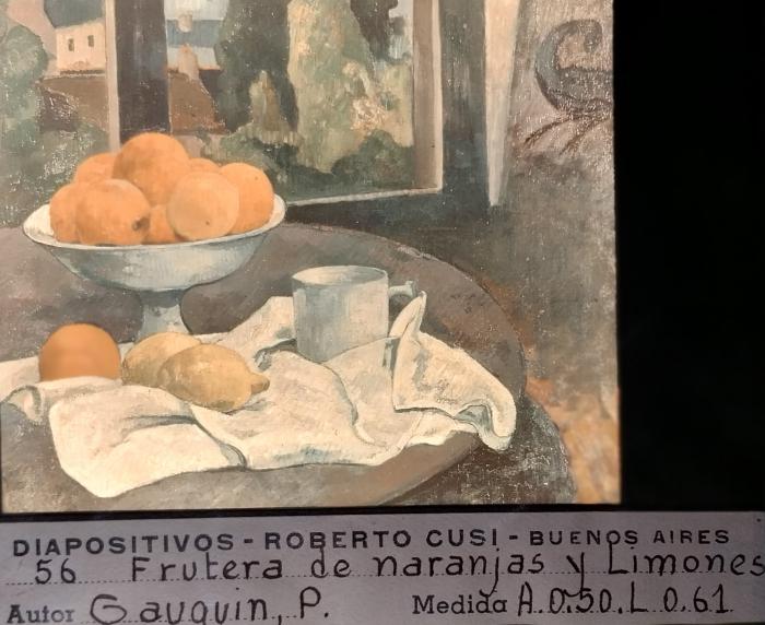 etiqueta impresa con campos y rellena de manera manuscrita:"Diapositivos-Roberto Cusi-Buenos Aires. 56 Frutera de naranjas y limones Autor: Gauguin, P Medida A050.LO.61" anotación manuscrita sobre etiqueta con lápiz azul: "4"