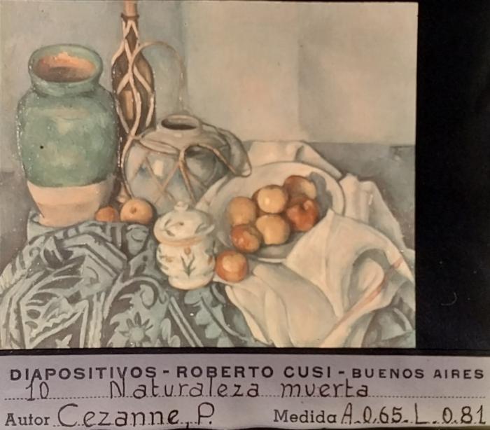 etiqueta impresa con campos y rellena de manera manuscrita:"Diapositivos-Roberto Cusi-Buenos Aires. 10 Naturaleza muerta Autor: Cezanne, P. Medida A.065.L0.81"